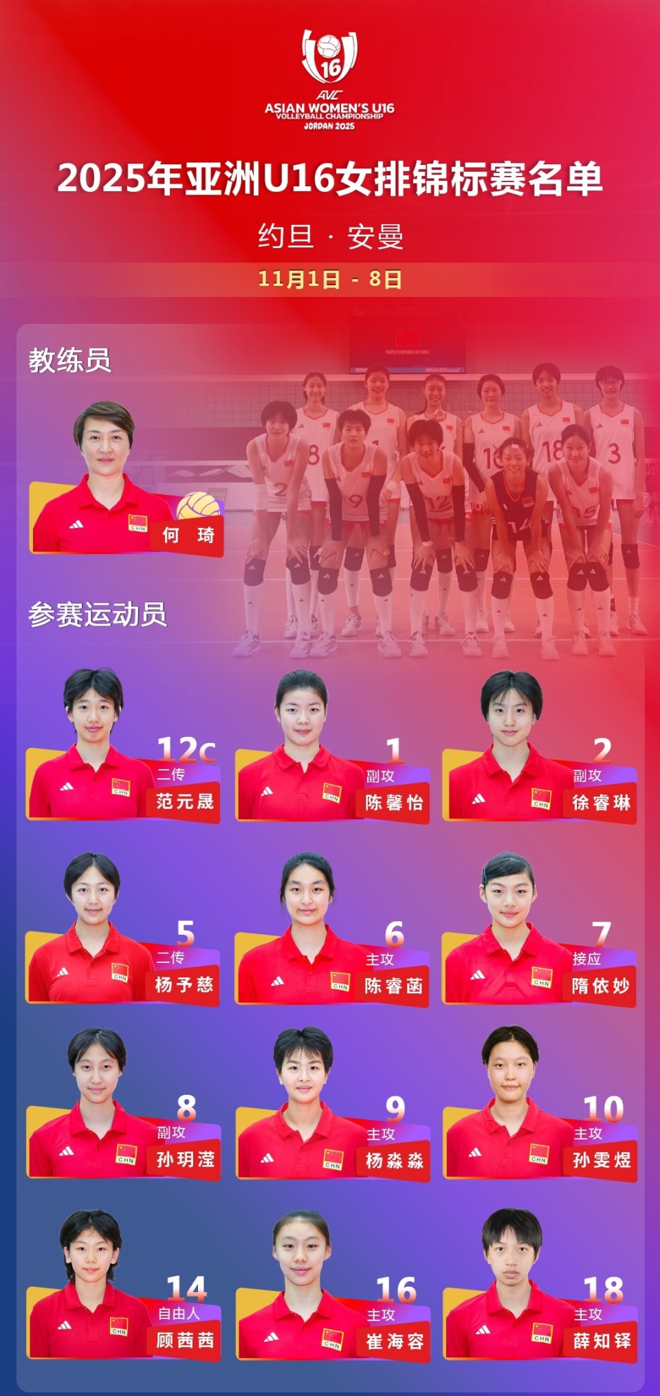 何琦!郎导白银一代主二传挂帅U16女排亚锦赛